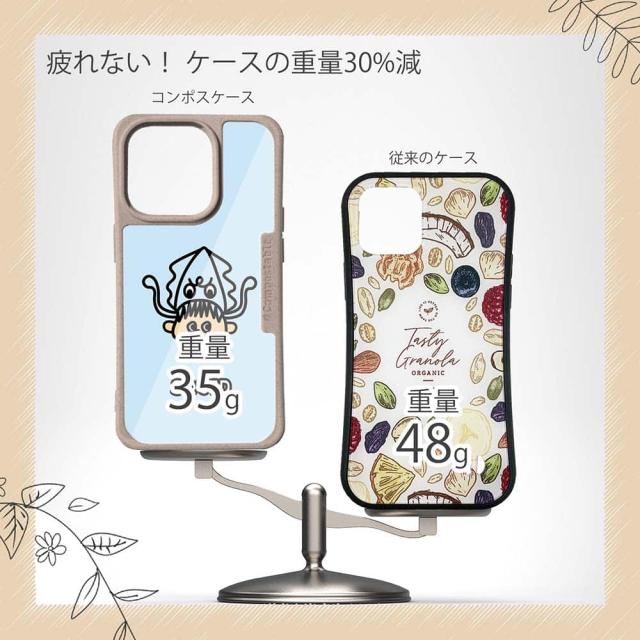 | ケースについて | 背面の内側に入れ込むデザインシートで、シーンに合わせて着せ替え可能。また、グリップしやすいクッション構造で、本体重量は約35gと軽減化を実現。さらに衝撃に強いSライン形状、究極に押しやすいボタン設計(切り込みが入ることで押し込む力を軽減)、背面のカメラ・レンズを保護する高さ設計となっております。生分解性プラスチック素材ながらも着脱もしやすく、割れない・指紋防止加工を施しています。 |