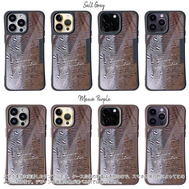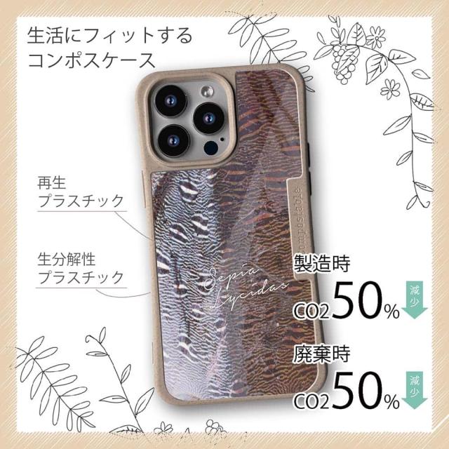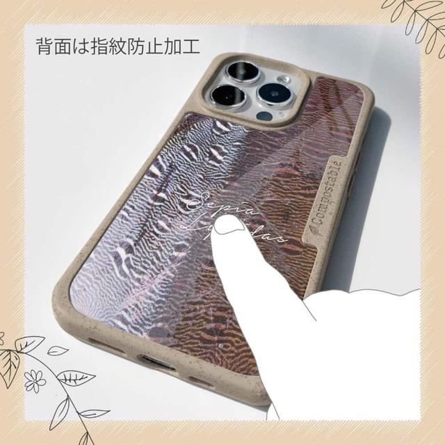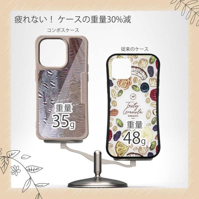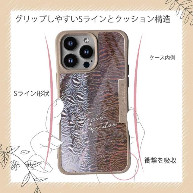 | ケースについて | 背面の内側に入れ込むデザインシートで、シーンに合わせて着せ替え可能。また、グリップしやすいクッション構造で、本体重量は約35gと軽減化を実現。さらに衝撃に強いSライン形状、究極に押しやすいボタン設計(切り込みが入ることで押し込む力を軽減)、背面のカメラ・レンズを保護する高さ設計となっております。生分解性プラスチック素材ながらも着脱もしやすく、割れない・指紋防止加工を施しています。 |