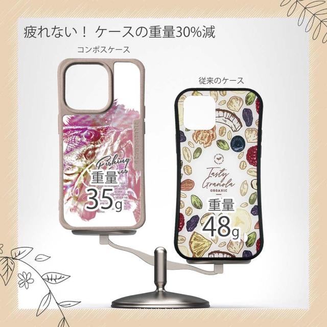 | ケースについて | 背面の内側に入れ込むデザインシートで、シーンに合わせて着せ替え可能。また、グリップしやすいクッション構造で、本体重量は約35gと軽減化を実現。さらに衝撃に強いSライン形状、究極に押しやすいボタン設計(切り込みが入ることで押し込む力を軽減)、背面のカメラ・レンズを保護する高さ設計となっております。生分解性プラスチック素材ながらも着脱もしやすく、割れない・指紋防止加工を施しています。 |