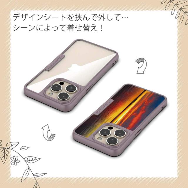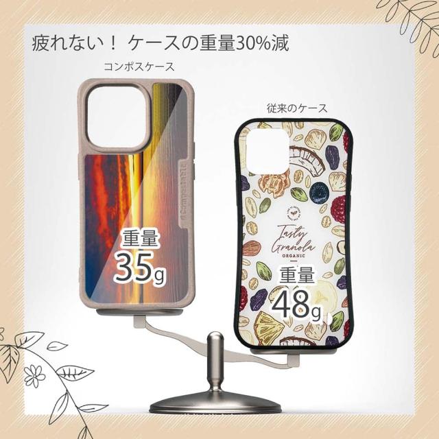 | ケースについて | 背面の内側に入れ込むデザインシートで、シーンに合わせて着せ替え可能。また、グリップしやすいクッション構造で、本体重量は約35gと軽減化を実現。さらに衝撃に強いSライン形状、究極に押しやすいボタン設計(切り込みが入ることで押し込む力を軽減)、背面のカメラ・レンズを保護する高さ設計となっております。生分解性プラスチック素材ながらも着脱もしやすく、割れない・指紋防止加工を施しています。 |