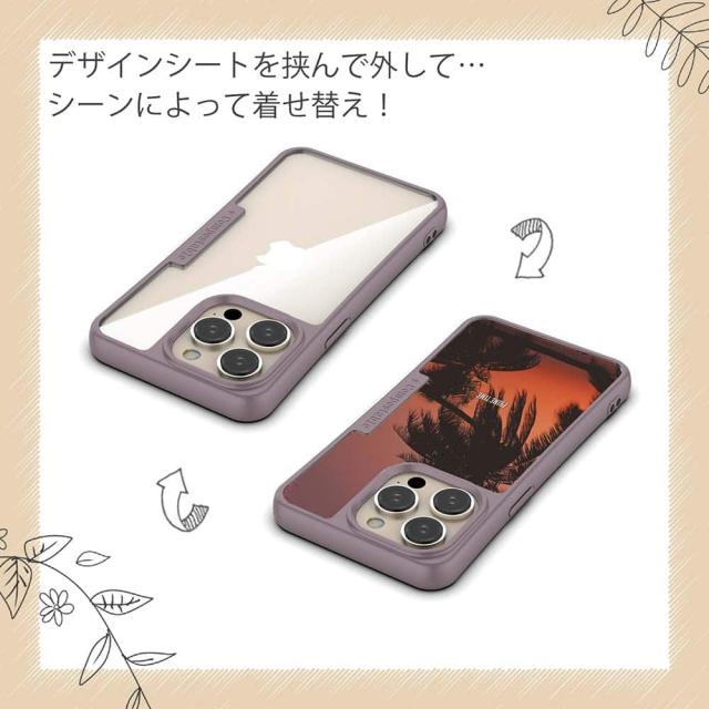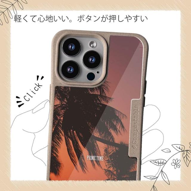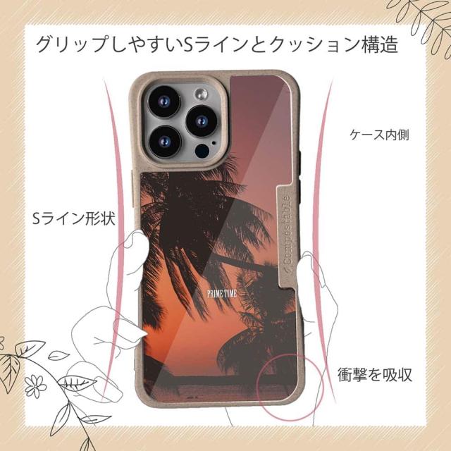 | ケースについて | 背面の内側に入れ込むデザインシートで、シーンに合わせて着せ替え可能。また、グリップしやすいクッション構造で、本体重量は約35gと軽減化を実現。さらに衝撃に強いSライン形状、究極に押しやすいボタン設計(切り込みが入ることで押し込む力を軽減)、背面のカメラ・レンズを保護する高さ設計となっております。生分解性プラスチック素材ながらも着脱もしやすく、割れない・指紋防止加工を施しています。 |