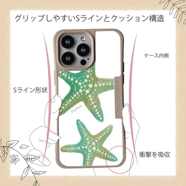 | ケースについて | 背面の内側に入れ込むデザインシートで、シーンに合わせて着せ替え可能。また、グリップしやすいクッション構造で、本体重量は約35gと軽減化を実現。さらに衝撃に強いSライン形状、究極に押しやすいボタン設計(切り込みが入ることで押し込む力を軽減)、背面のカメラ・レンズを保護する高さ設計となっております。生分解性プラスチック素材ながらも着脱もしやすく、割れない・指紋防止加工を施しています。 |