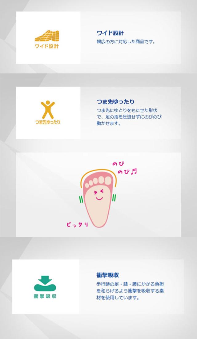 【つま先ゆったり】つま先にゆとりをもたせた形状で、足の指を圧迫せずにのびのび動かせます。