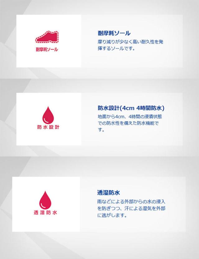 【Shut Dry(R)】水蒸気のみを通す微細な穴を備える透湿防水フィルムが、外部からの雨・水の浸入を防ぎながら靴内の湿気を外部に逃がして快適です。
