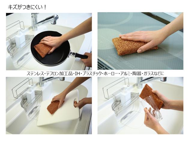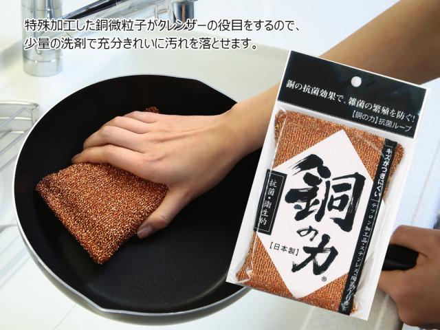 ●特殊加工した銅微粒子がクレンザーの役目をするので、少量の洗剤でも充分キレイに汚れが落ちます。