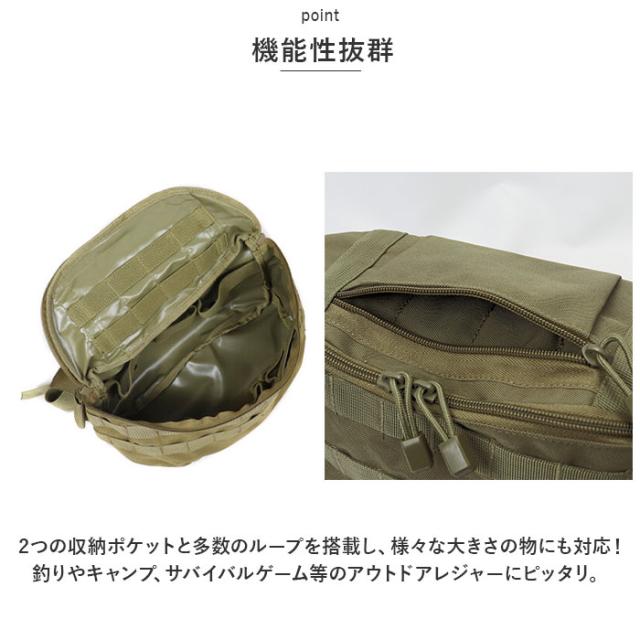 | 商品説明 | ・MOLLE方式に対応した本格的なミリタリーウエストバッグが新発売♪ 【本格的なミリタリー仕様】 ・1997年以降アメリカやイギリスなど一部のNATO加盟国の軍隊が採用している個人装備システム「MOLLE方式」に対応。 ・ポーチなど付属品が簡単に取外しできるモジュラー式で本格的な見た目と仕様が魅力的♪ 【ミニマルに収納】 ・コンパクトなサイズながらマチ幅があり、500mlペットボトルや長財布など日常のお出かけに必要な最低限の小物をすっきりひとまとめ♪ 【機能性抜群】 ・2つの収納ポケットと多数のループを搭載し、様々な大きさの物にも対応!釣りやキャンプ、サバイバルゲーム等のアウトドアレジャーにピッタリ。 【ウェビングを搭載】 ・バッグ背面のウェビングは別のMOLLE方式のバッグに装着することも可能。 【2WAY】 ・ウエストポーチとして使えるのでアクティブシーンにも最適。 ・ベルトは長さ調節ができ、斜め掛けもOK! 【ポケット仕様】 ・メインルーム・・・オープンポケット×1、収納ループ:大×3、小×24 ・右サイド・・・収納ループ:小×6 ・左サイド・・・収納ループ:小×6 ・フロント・・・収納ループ:小×16 ・トップ・・・ファスナーポケット×1 |