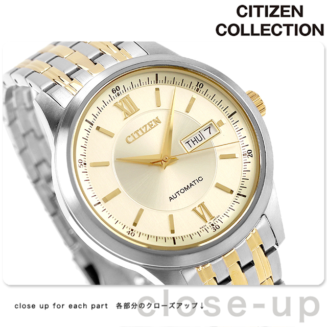 正規品 7年保証キャンペーン 送料無料 シチズン コレクション メカニカル クラシック 日本製 メンズ 腕時計 NY4057-63P CITIZEN COLLECTION アナログ ゴールド シルバー ◆すっきりとしたシンプルでクセのない文字盤のデザイン。デイ&デイト表示があり、視認性にも優れています。バンドは、シルバーとウォームゴールドを組み合わせた人気のツートンカラーを採用。時刻を合わせる際、りゅうずを引き出すと秒針が止まる「秒針停止機能」を搭載したキャリバーを採用しています。文字盤外周が従来のプレスパターンからヘアラインに変更、より金属の質感を感じられやすくなりました。クラシックなデザインが大人の腕元を演出します。 発売日:2023年10月発売 機械式腕時計