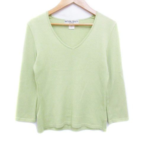 【中古】ナチュラルビューティーベーシック ニット カットソー 七分袖 Vネック M 黄緑 ライトグリーン レディース