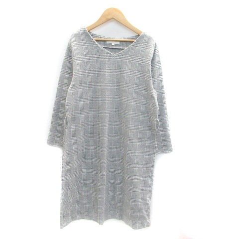 【中古】グローブ grove ワンピース Vネック 長袖 ミモレ丈 グレンチェック柄 L グレー オフホワイト レディース