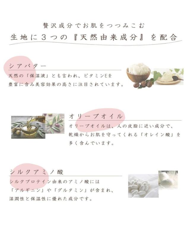 シアバター×オリーブオイル×シルクアミノ酸を配合したお肌に優しい生地で作られたアイテム