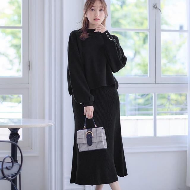 ふんわりボリューム袖にパール調ボタンをあしらった上品ニット。