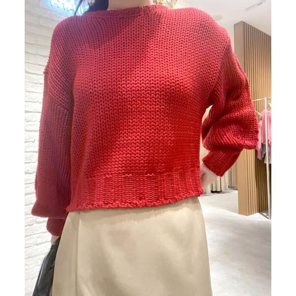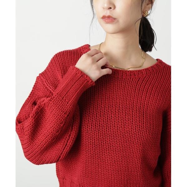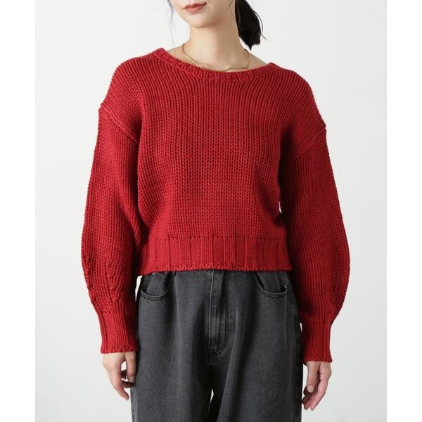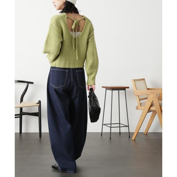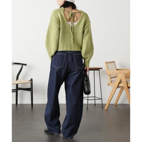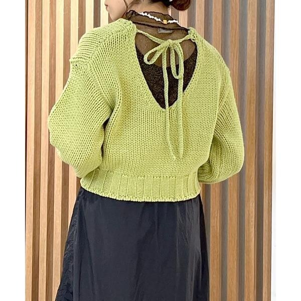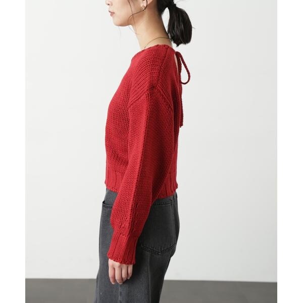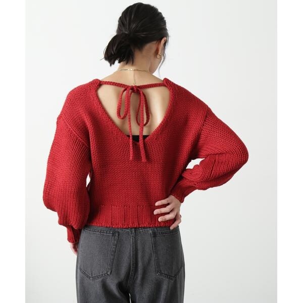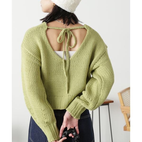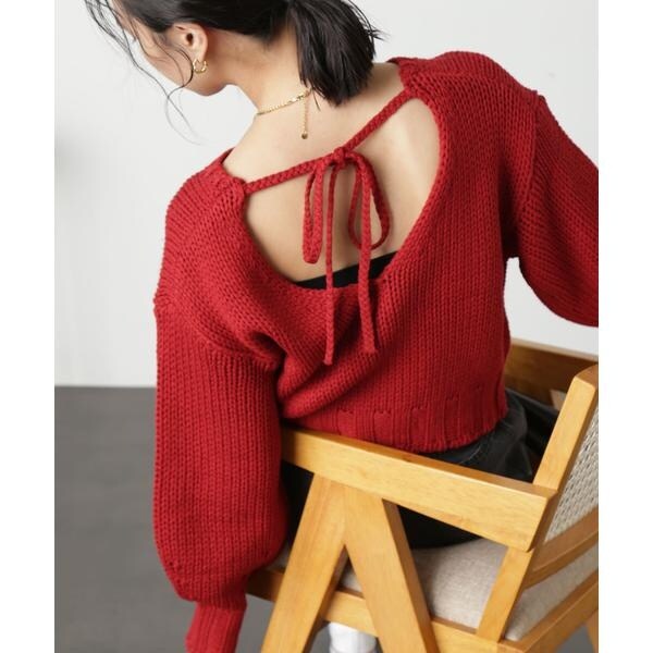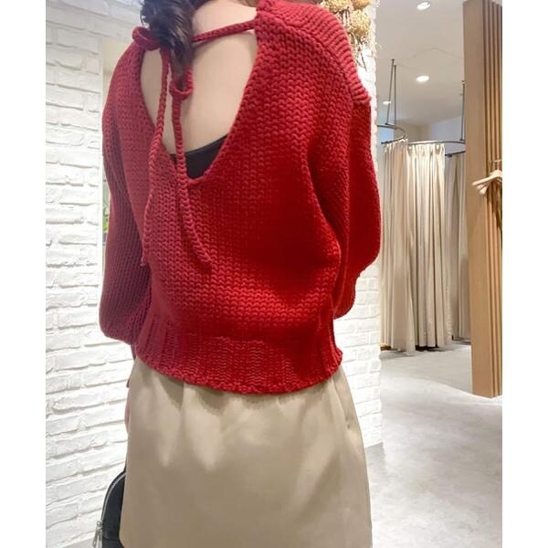 ざっくりと手編み風に仕上げたバックシャンなニット。バックスタイルは深めのVネックで抜け感をだし、三つ編みの紐でネックが抜けすぎないようにデザインしています。ボリュームのあるスリーブは、袖先に向かって丸いフォルムが出るよう目立てを入れてさり気ないアクセントに。背中が開いているので、インナーにキャミソールやロンTなどをレイヤードして、デニムパンツ合わせでカジュアルに着るのがおすすめです。※モデルの着用画像の場合、光の当たり具合により、実際の色味と異なって見えることがございます。色味は、商品単体の画像をご参照ください。