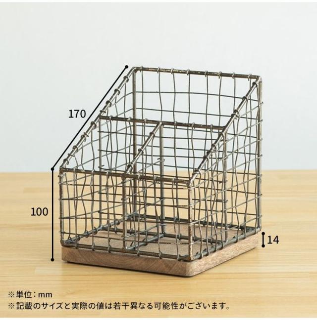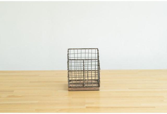アンティーク調のワイヤーを編んで、底板には天然木を組み合わせました。