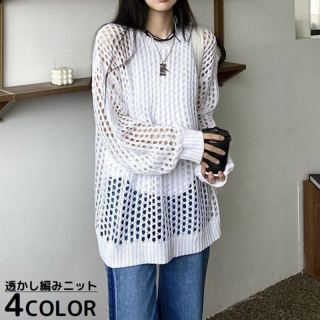 サマーニット 長袖セーター レディース メッシュ 透かし編み 重ね着 レイヤード ゆったり 透け感 UVカット 紫外線 冷房対策