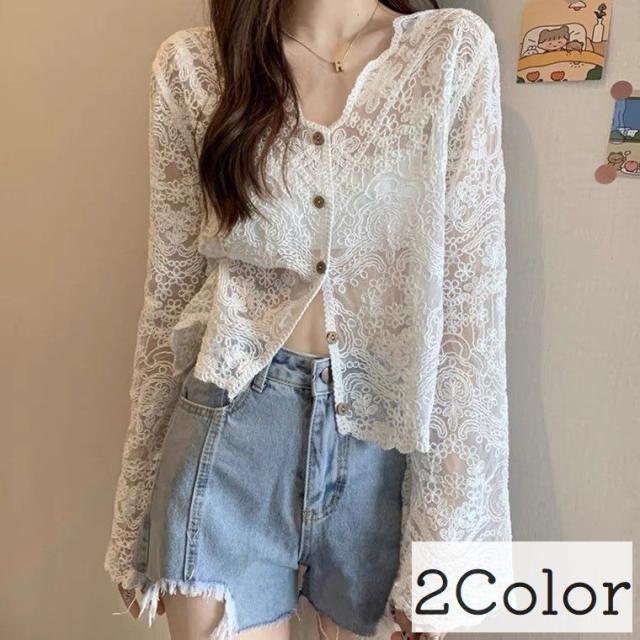ガーディガン レースブラウス 羽織 シースルー 深Vネック 長袖 透け感 おしゃれ 上品 ボタン 重ね着 大人可愛い 着回し お