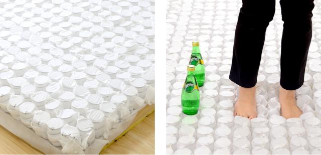 独立構造のコイルは、圧力のかかった部分だけが沈み込み、周囲への振動の伝わりを軽減します。コイルの上に置いたビンの近くに立っても倒れない程に振動が少ないので、隣で寝ている人の寝返りなども気になりません。