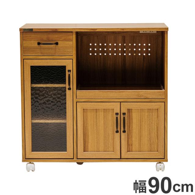 キッチンカウンター 幅90cm カントリー調 レンジ台 キャスター付き 炊飯器 モダン 木目調 シンプル ガラス調 扉 引き出し おしゃれ 北欧 かわいい 新生活 一人暮らし(代引不可)【送料無料】