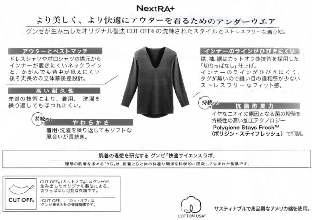 | 特徴 | より美しく、より快適にアウターを着るためのアンダーウェア グンゼが生み出したオリジナル製法CUT OFF(R)の洗練されたスタイルとストレスフリーな着心地。 【YG】 Vネックロングスリーブシャツ ・アウターとベストマッチ ドレスシャツやポロシャツの襟元からインナーが覗きにくいネックラインと、 かがんでも背中が見えにくい後ろ丈長めの立体前後差設計。 ・高い耐久性 先進の技術により、着用、洗濯を繰り返してもほつれにくい。 ・持続する「やわらかさ」 着用、洗濯を繰り返してもソフトな風合いが長続き。 ・インナーのラインがひびきにくい 襟、袖、裾はカットオフ(R)技術を採用した「切りっぱなし」仕上げ。 インナーのラインがひびきにくく、タグが無いので縫い目の違和感が少ない ストレスフリーなフィット感。 ・持続する「抗菌防臭力」 イヤなニオイの原因となる菌の増殖を持続性の高い加工テクノロジー Polygiene Stays Fresh(TM)[ポリジン・ステイフレッシュ]で抑制。 |