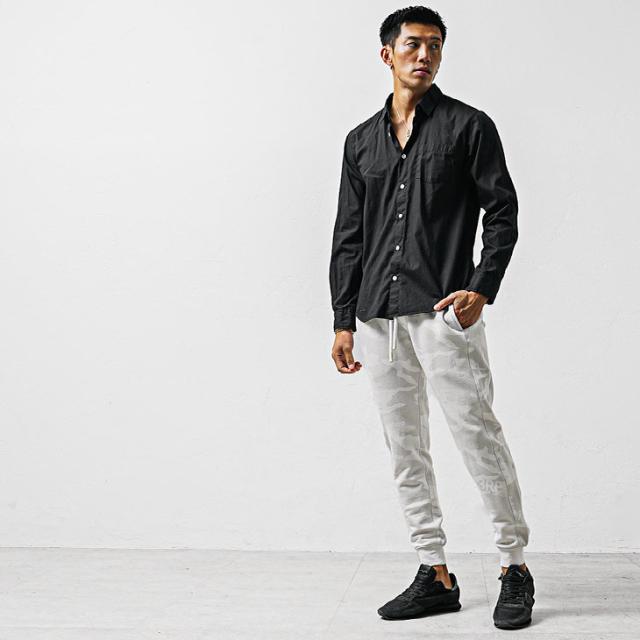 洒落感ある総柄で魅せるオトナのスウェットパンツ。