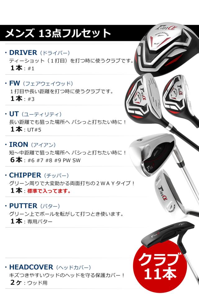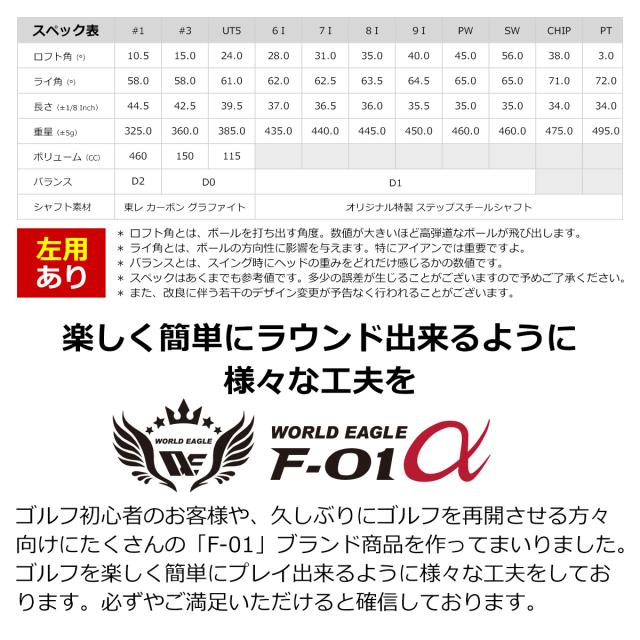 新たなレジェンドの1ページに、大自然の空気に囲まれたゴルフコースに一際映えるF-01αモデル、2009年、ワールドイーグルF-01が誕生、5年の歳月をかけ、に新生F-01αが新たにあなたのクラブとして生まれかわりました。大地の鼓動を感じ、一面緑に覆われたゴルフコースで思う存分打ち放ってみてくだい!新たなレジェンドの1ページに、大自然の空気に囲まれたゴルフコースに一際映える F-01αモデル、2009年、ワールドイーグルF-01が誕生、5年の歳月をかけ、に新生F-01αが新たにあなたのクラブとして生まれかわりました。 大地の鼓動を感じ、一面緑に覆われたゴルフコースで思う存分打ち放ってみてくだい!・WOOD : #1 #3・UT : 24・IRON : #6 #7 #8 #9 PW SW ・CHIPPER : F-01α 2way chipper・PUTTER : 専用パターウッド2本、UTアイアン1本、アイアン6本、 チッパー、パターウッド用ヘッドカバー2点の合計13点セット!!