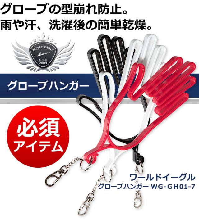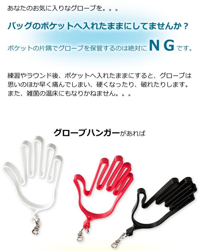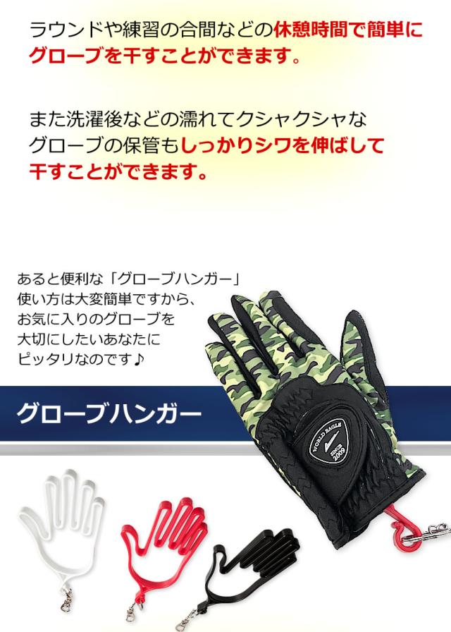 ワールドイーグル グローブハンガー WG-GH01-7グローブの型崩れ防止。雨や汗、洗濯後の簡単乾燥。無料特典!ギフト包装対応!グローブハンガーがあればラウンドや練習の合間などの休憩時間で簡単にグローブを干すことができます。また洗濯後などの濡れてクシャクシャなグローブの保管もしっかりシワを伸ばして干すことができます。あると便利な「グローブハンガー」使い方は大変簡単ですから、お気に入りのグローブを大切にしたいあなたにピッタリなのです♪カラーはレッド/ブラック/ホワイトの3色からお選びください。左右兼用ですので利き手を選びません。キャディバッグ、ボストンバッグにカンタン装着できる金具付き。ゴルフ以外のグローブ・手袋にも使用でき、イベントやゴルフコンペの景品、プレゼントとしても喜ばれます。大変便利なグローブハンガーです。スポーツのお供にぜひ!カラー:ブラック、ホワイト、レッド重量:55g素材:プラスチックサイズ:幅 11.5 cm×長さ 18.5 cm×厚み 1.3 cm柄の部分:4.5 cmチェーン:8.5 cm対象者:メンズ、レディース兼用(ジュニアは不可)左右兼用