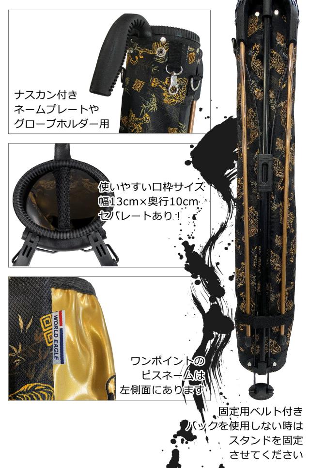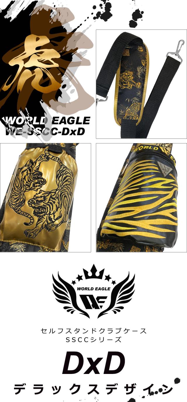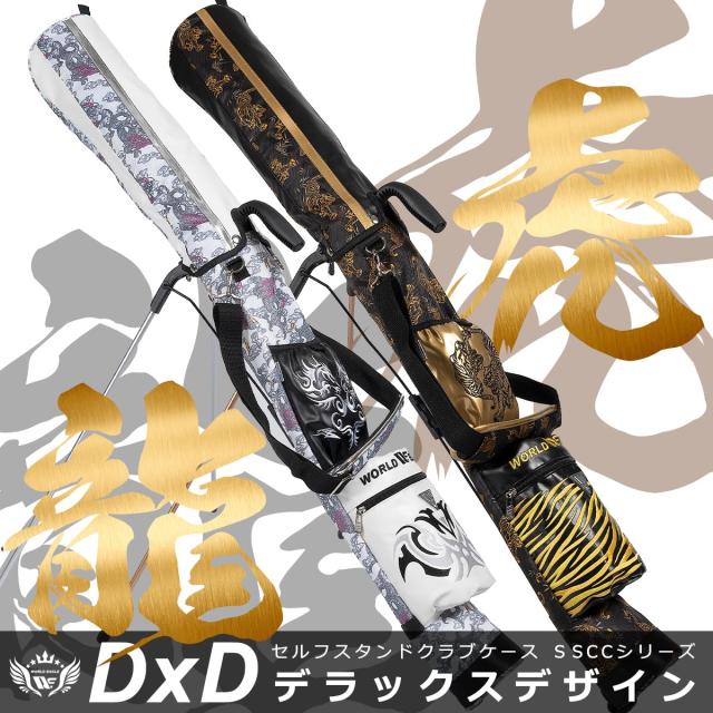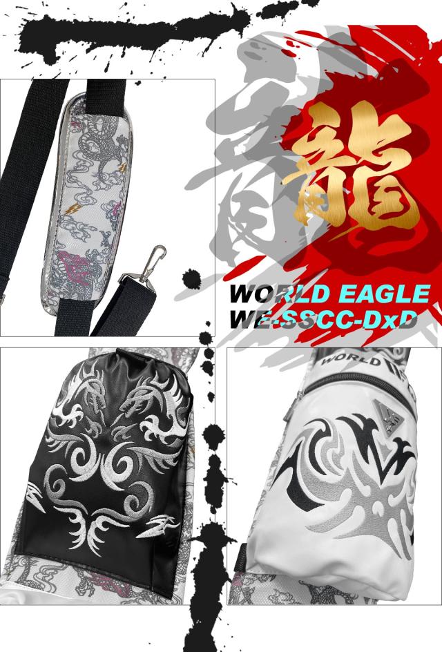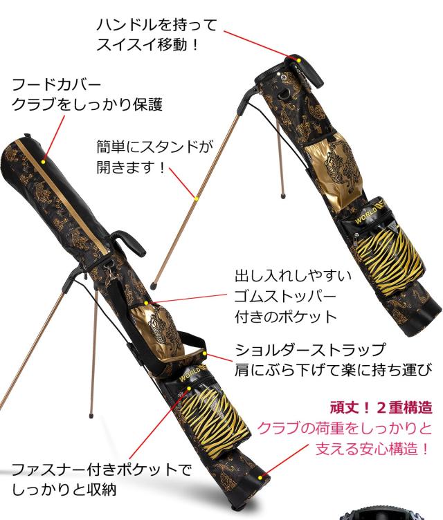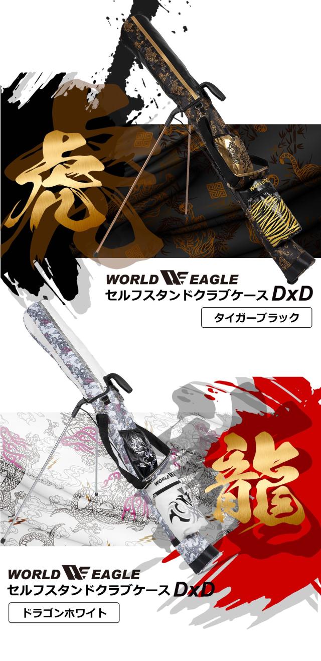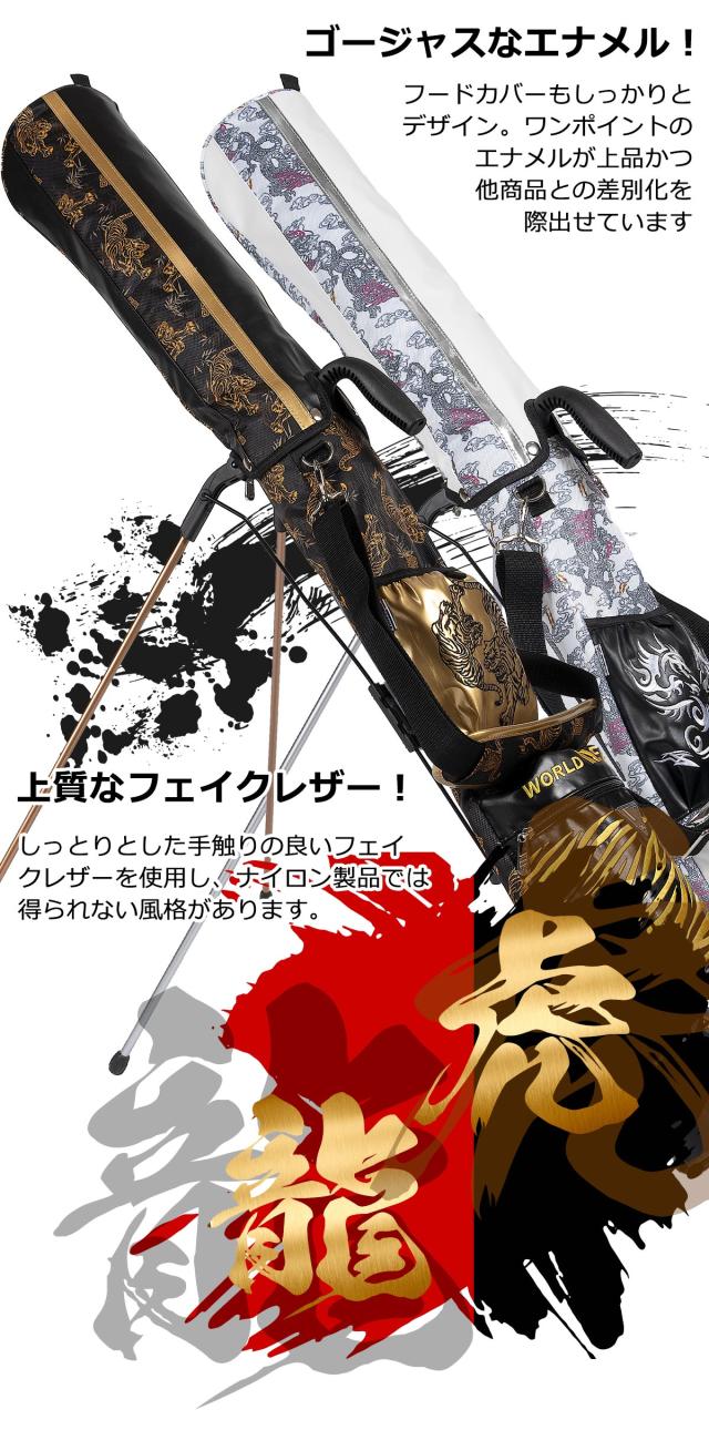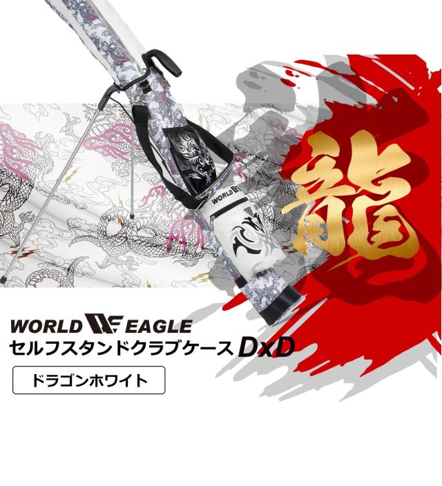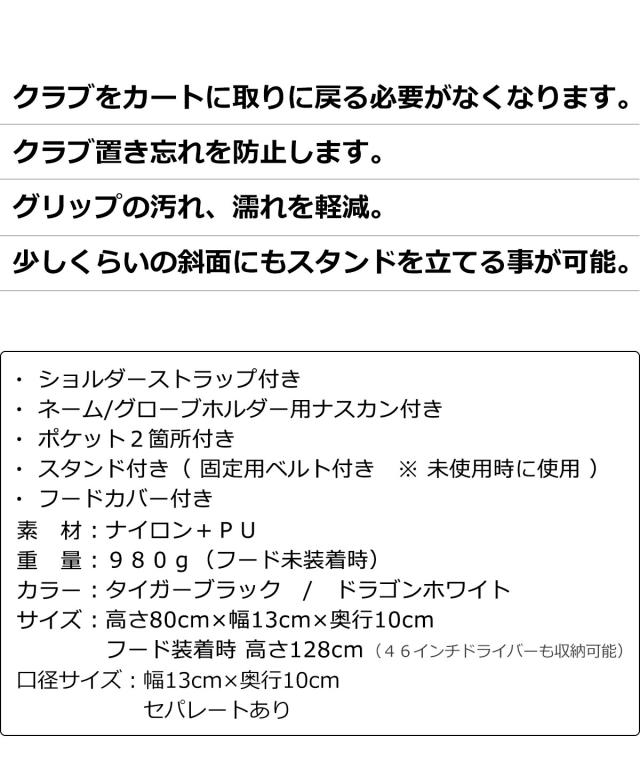 ■WORLD EAGLE(ワールドイーグル)セルフスタンドクラブケースDxD(デラックスデザイン)WE-SSCCDT-9・クラブをカートに取りに戻る必要がなくなります。・クラブ置き忘れを防止します。・グリップの汚れ、濡れを軽減。・少しくらいの斜面にもスタンドを立てる事が可能。ゴージャスなエナメル!フードカバーもしっかりとデザイン。ワンポイントのエナメルが上品かつ他商品との差別化を際出せています。上質なフェイクレザー!しっとりとした手触りの良いフェイクレザーを使用し、ナイロン製品では得られない風格があります。「龍虎」和柄プリント。厄災を祓い守護すると崇められてきた威厳あふれる和柄2種をふんだんにプリントしました。ショルダーストラップ付き、ネーム/グローブホルダー用ナスカン付き、ポケット2箇所付き、スタンド付き( 固定用ベルト付き ※ 未使用時に使用 )、フードカバー付き素材:ナイロン+PU重量:980g(フード未装着時)カラー:タイガーブラック / ドラゴンホワイトサイズ:高さ80cm×幅13cm×奥行10cm フード装着時 高さ128cm口径サイズ:幅13cm×奥行10cm