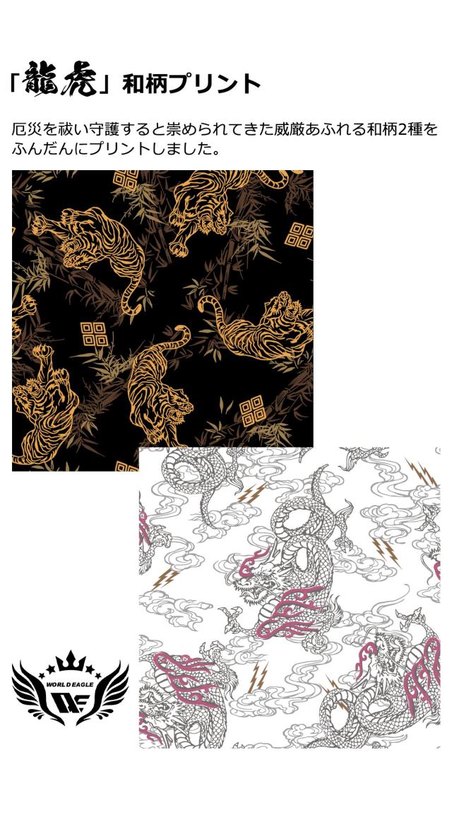 「龍虎」和柄プリント。厄災を祓い守護すると崇められてきた威厳あふれる和柄2種をふんだんにプリントしました。