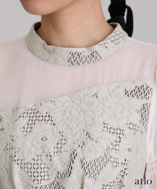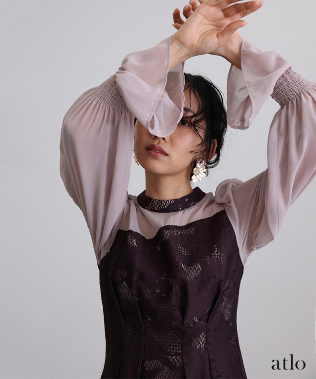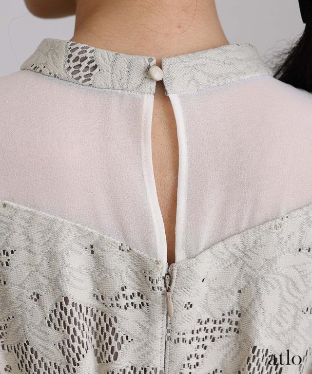 デコルテ部分にはアシンメトリーなデザインが施され、独特の魅力を演出。