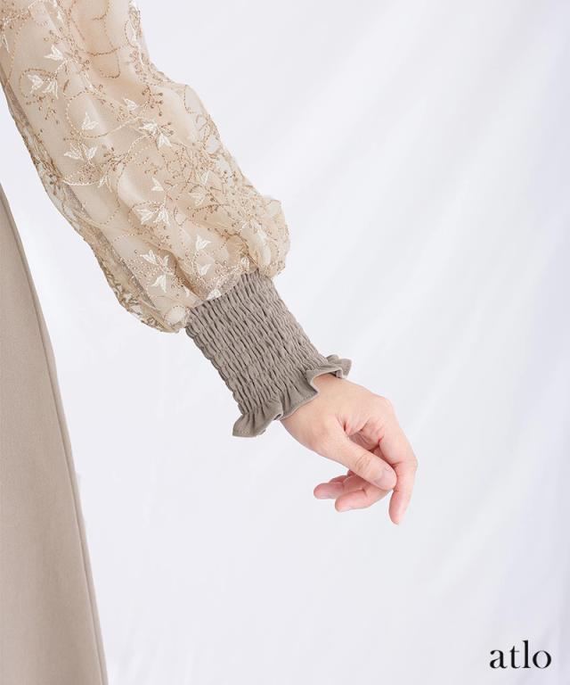 袖には光沢感のある糸で刺繍を施し、上品さを引き立てます。