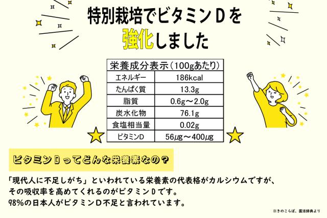 ■栄養成分表示 (100gあたり):エネルギー 186kcal、たんぱく質 13.3g、脂質 0.6g〜2.0g、炭水化物 76.1g、食塩相当量 0.02g、ビタミンD 56μg〜400μg