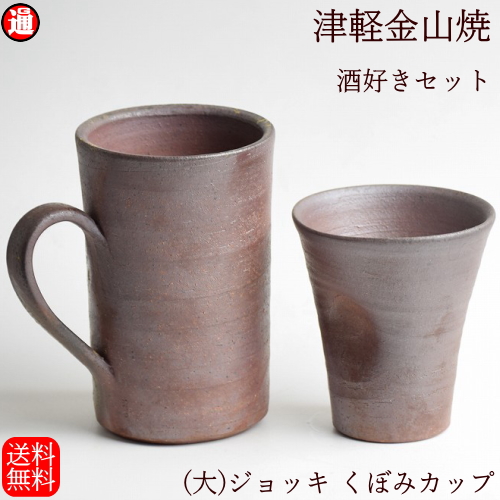 酒好きセット 送料無料 大ジョッキ(口-9-h13-371g 容量500cc)×1 くぼみカップ(口9-h10-195g 200cc)×1 津軽金山焼 ビアカップ ぐい呑 陶器 酒器 和モダン 食器 渋い 酒器 セット おしゃれ 陶器 晩酌 陶器 父親 誕生日 プレゼント