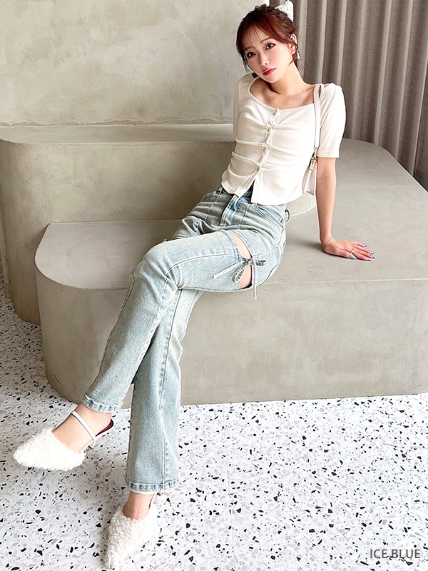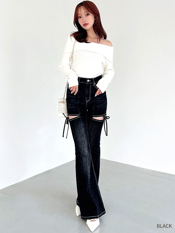 RESEXXY リゼクシー デニム パンツ カット アウト リボン デニム パンツ フレアパンツ ブーツカット ストレッチ アイスブルー ブラック 152530765301 152542419101