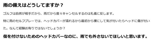 ●次はヘッドカバーも浮かしたいですね(表面に付くしぶきでは、中まで濡れることは先ずありませんが、ヘッドは必ず拭いてから被せてください)