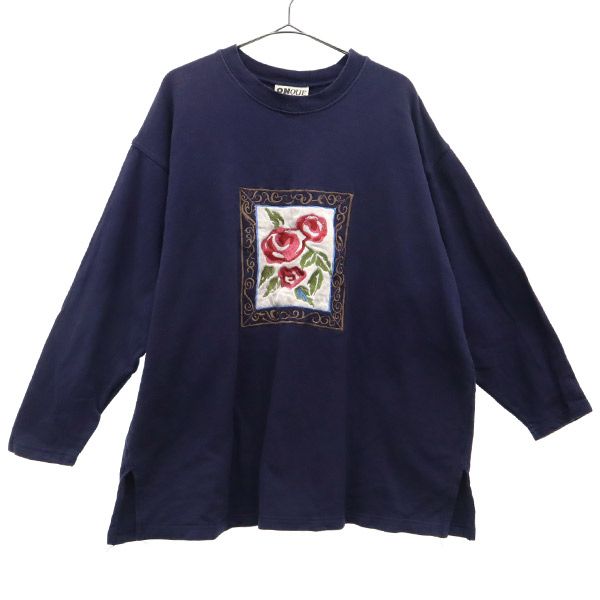 ONQUE TOO バラ刺繍 長袖 スウェット トレーナー 1X ネイビー ONQUE TOO レディース