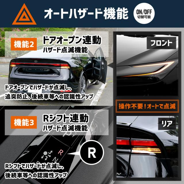 | 60系 プリウスを操る!! このハーネス一つで10機能追加!全窓をスマートキーでオープン・クローズ出来る、便利機能満載のアイデア商品です。 カプラーONのハーネスを取り付けるだけで車両のポテンシャルを引き出します! 【機能1】エンジン掛けたままロック機能(※1) ・コンビニ等少しの買い物でエンジンをかけたままロック出来ることによりクーラーや暖房を切ることなく戻ってきたときに快適 ・乗り出し時に車内を温めたり冷やしたりする際にそばにいなくても大丈夫 ・リスタートすることによるバッテリーの消耗を減らす ・スマホのバッテリーが無く充電したいとき ドアを閉めた直後に、エンジンが掛かっている事を示す警告音が鳴ります。 ロック機能を使用する場合は、警告音が鳴り終わってからロックして下さい。 ※ロック時に再び警告音が鳴りますが、こちらは商品の仕様となります。 【機能2】ドアオープン連動ハザード点滅機能 ・ドアオープンでハザードが点滅し、追突防止、後続車等への認識性アップ エンジンのON時・OFF時に関わらず、ハザード点滅が機能します。 【機能3】Rシフト連動ハザード点滅機能 ・Rシフトでハザードが点滅し、後続車等への認識性アップ 【機能4】車速/Dシフト連動ドアロック機能 ・時速15km前後またはDシフトでドアロックし、走行中にドアが開くのを防ぐ 【機能5】Pシフト/エンジン連動ロック解除機能 ・停止後PシフトまたはエンジンOFFでロック解除するため、停止していない状態でドアが開くのを防ぎます。 【機能6】急ブレーキ連動ロック解除機能 ・時速40km以上の急減速時に自動でドアロックを解除し、緊急時の脱出に備えます。また、何事もなかった場合は1分後に時速15kmで再ロックします。 【機能7/8】スマートキー連動 全窓オープン・クローズ機能(※2) ・車内が暑さで高温になっている時に乗り込む前にスマートキーで換気が可能! ・窓の閉め忘れた際にわざわざエンジンONの必要無し 機能7:お車がドアロック状態の場合は、スマートキーのアンロックボタンを一回押して(車両をアンロック状態にして)から操作を行って下さい。 【機能9】ドアロック連動 全窓クローズ機能(※2) ・窓を閉め忘れて降車してもエンジンONする必要なしで自動で全窓が閉まります 【機能10】ヘッドライト連動アンサーバック機能 ・車が多い駐車場などで自分の車の位置がすぐにわかる ・ヘッドライトが15秒光ることによって周りを照らしてくれるため、足元が明るく移動できる 「機能10」はお車のオートライトに連動しますので、周囲が一定以上暗くなった環境で作動します。 (※1)自分でロック解除が出来る可能性が考えられるお子様が乗車されている場合は十分注意してください。 (※2)純正で窓がAUTOになっていない窓は安全装置が付いていませんので気を付けてください。 |