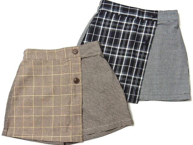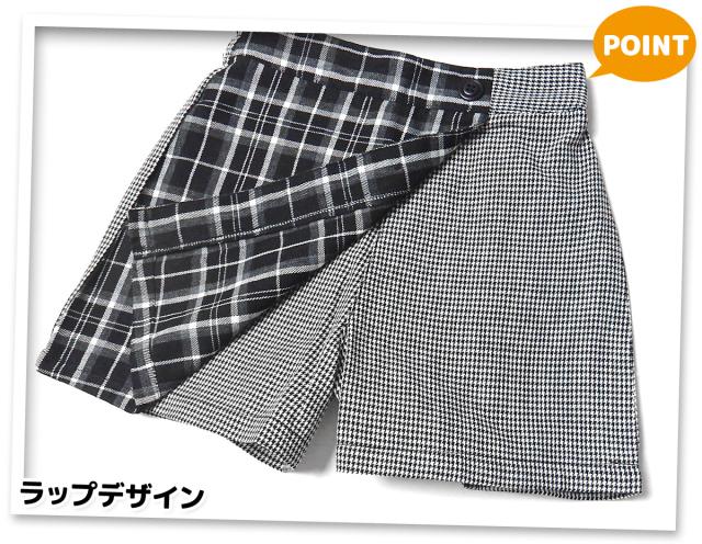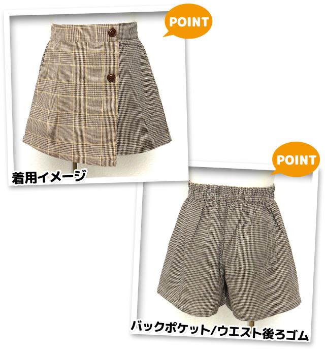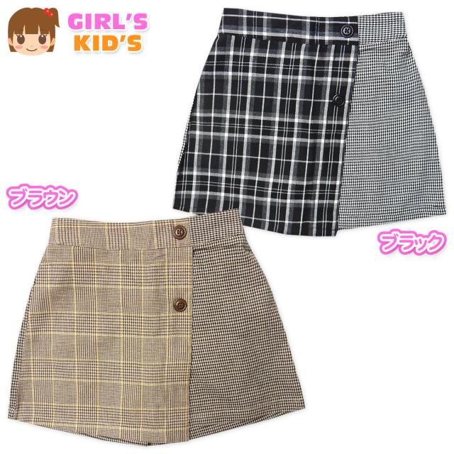 【送料無料】女児 キッズ ラップ キュロット 千鳥格子 グレンチェック切替 ウエストゴム ボトムス nw-1146【メール便対応】