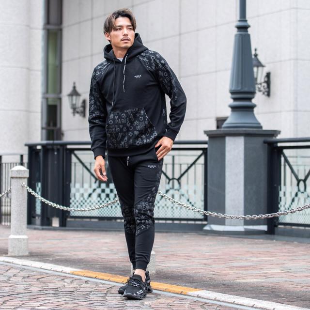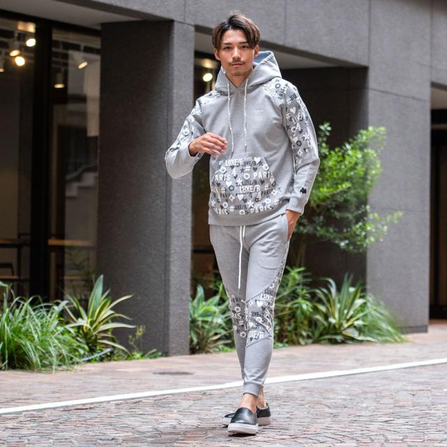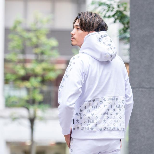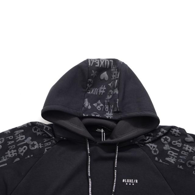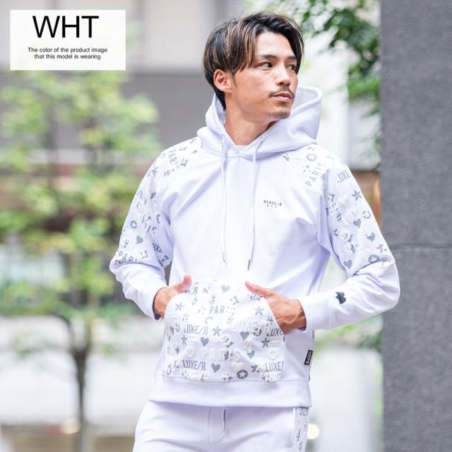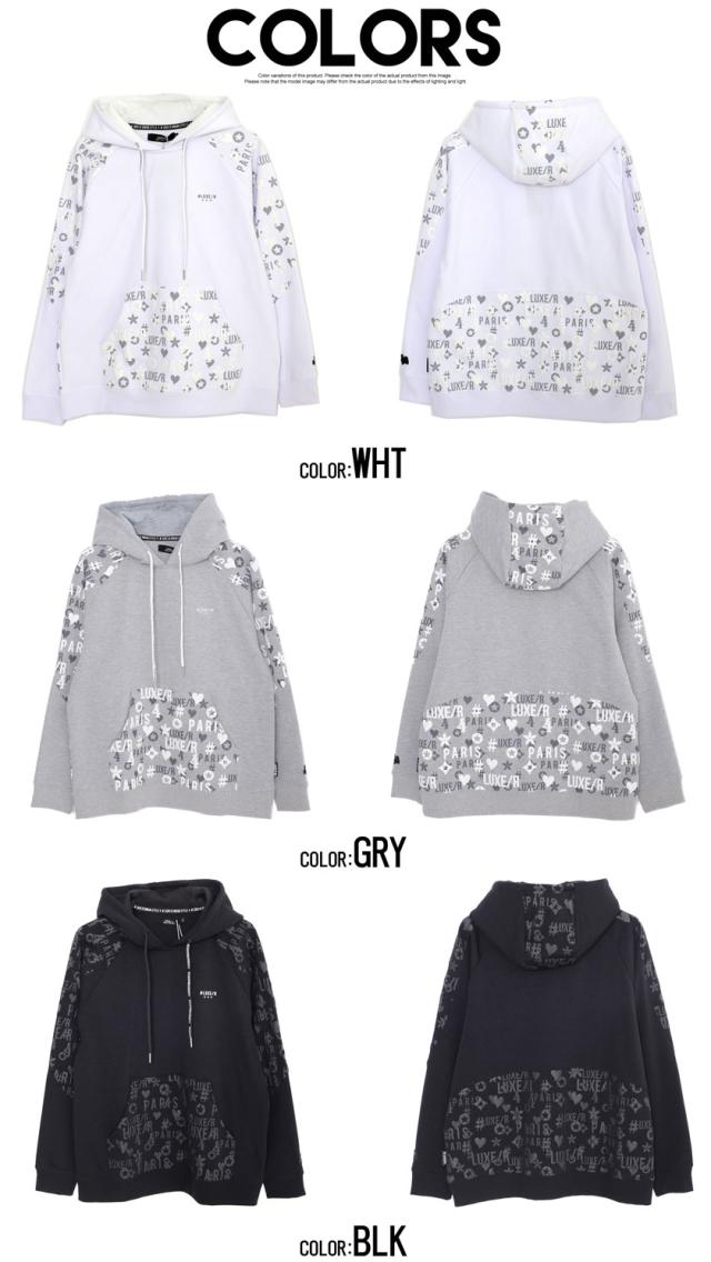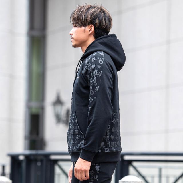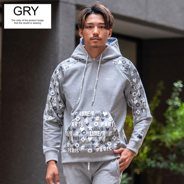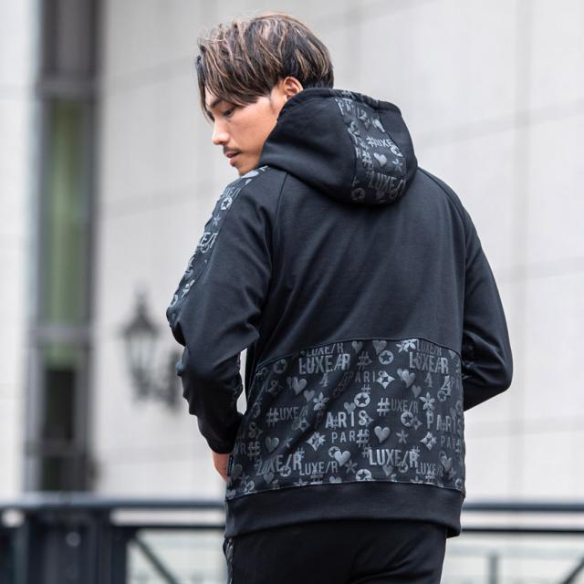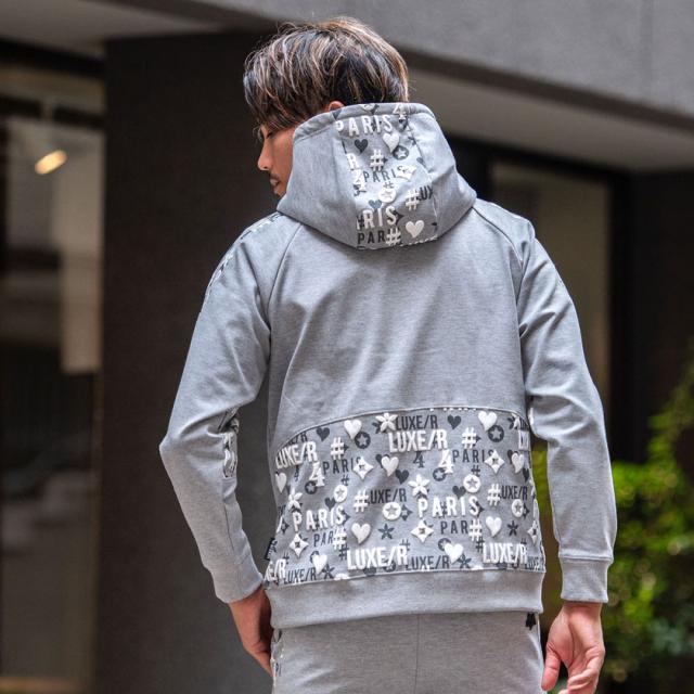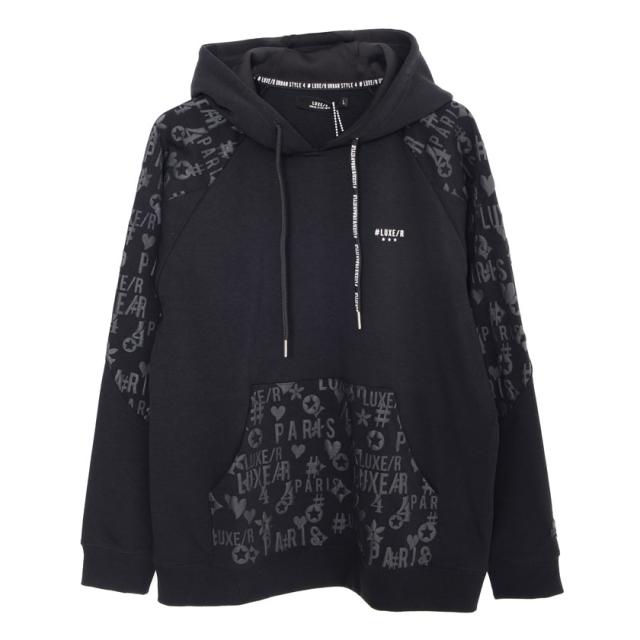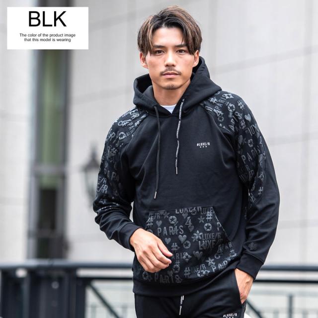 パーカー メンズ 切り替え 総柄 プリント ロゴ 大人 おしゃれ プルオーバー シンプル 大人 スポーツ セットアップ可 トップス ブラック グレー ホワイト 黒 白 M L XL LUXE/R ユニセックス 男性 男 服 秋 冬 秋冬 20代 30代 40代 ファッション メンズファッション 東京 プレゼント 誕生日 記念日 贈り物 ギフト配送について
