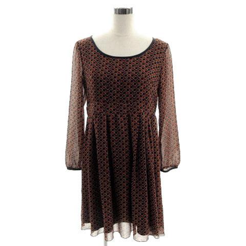 【中古】インディヴィ INDIVI ワンピース 長袖 シースルースリーブ ひざ丈 タック 日本製 総柄 赤系 紺 ベージュ 42