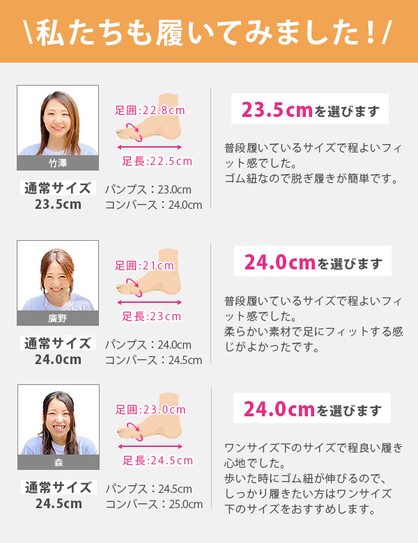 取り扱いサイズ:22.5cm 23cm 23.5cm 24cm 24.5cm
