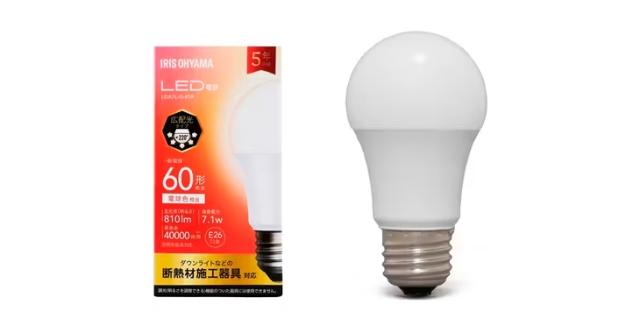 トップランナー制度対応、2017年度省エネ法目標基準値達成のLED電球です。白熱電球のように広範囲に明るい広配光タイプなので、リビング・ダイニング・キッチン・脱衣所などの照明に最適なLED電球です。口金サイズがE26口金なので、照明器具を替えることなくご使用いただけます。密閉形器具や断熱材施工器具にご使用可能です。(※密閉形器具や断熱材施工器具の種類によって、寸法が合わない、熱がこもる等の要因により、使用できなかったり、寿命が短くなる場合があります。)(※調光(明るさを調整できる)機能の付いた器具には使用できません。)5年保証で長寿命約40000時間の、ランプ交換の手間が少ないLED電球です。光色はバランスが取れた明るさで過ごしやすい空間を演出する「昼白色相当」と温かみのある「電球色相当」の2種類です。