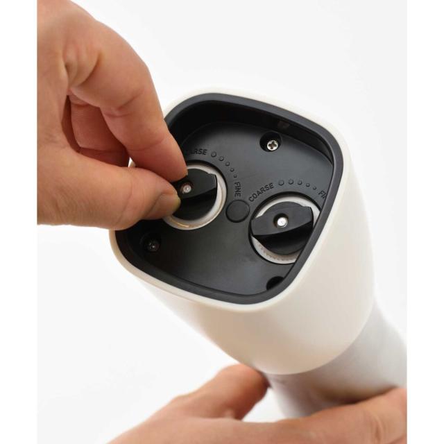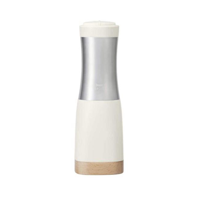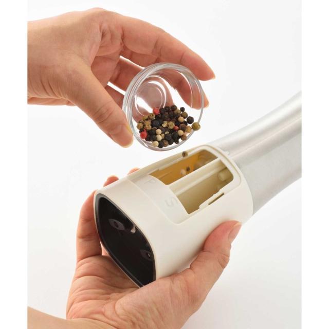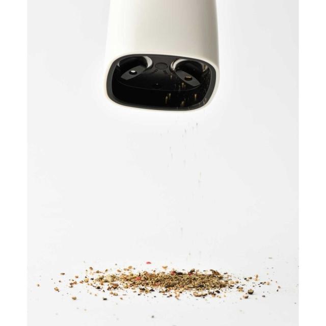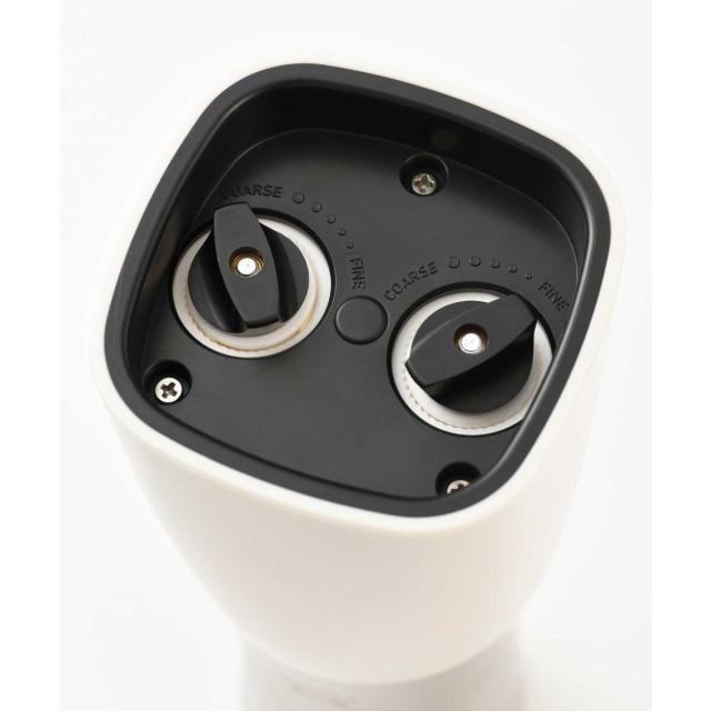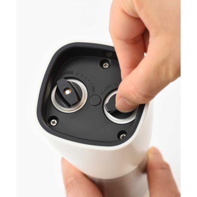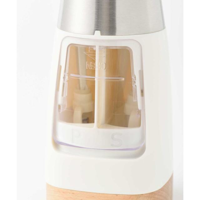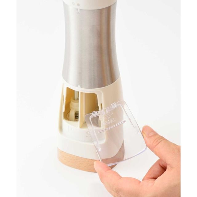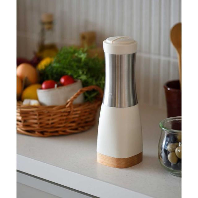 片手で挽けて、粗さも調整できるインテリアになじむ1台2役の電動ミル − 1本に2種のスパイスが入るので、持ち替える手間なくスマートに調理が愉しめます。底面のダイヤルでお好みの粗さに調整可能。美しいフォルムとカラーリングに、ウッド調のスタンドを組み合わせた高級感あふれるデザインで、正面はスパイスが見えないため、キッチンやダイニングテーブルに置いてもインテリアになじみます。背面のフタは透明になっているため、中に入っているスパイスの種類、残量も一目瞭然。コンパクトなので卓上に置いても邪魔になりません。