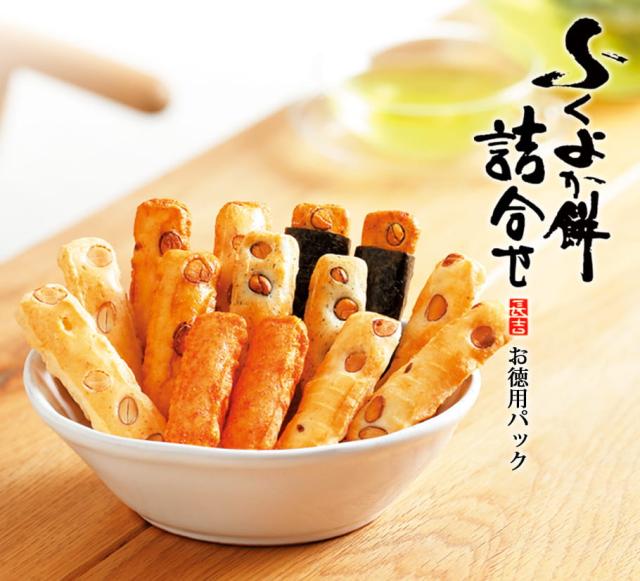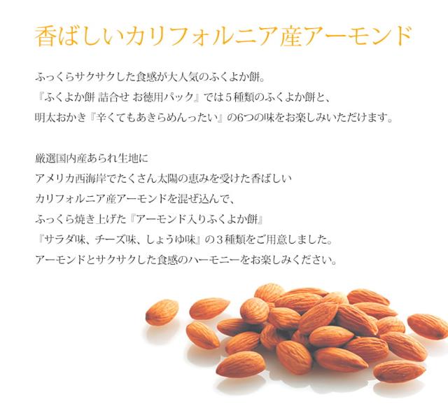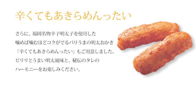軽やかなサクサクした食感が人気の『ふくよか餅』5種類と、福岡名物辛子明太子を使用した『辛くてもあきらめんったい』を一度に楽しめるひと袋です。