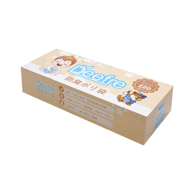 【驚異の脱臭効果】収容物からの臭気の透過を抑制するバリア層を有し、数日放置されても嫌なニオイが漏れません。子供のオムツ処理やペットの汚物始末など、様々なシーンで大活躍。<br>【高品質素材】共押出し法により0.02mm厚の7層フィルムを作製し、柔らかさも強度もあります。香料不使用で敏感な嗅覚がある赤ちゃんにも優しい。<br>【使い方は簡単】箱を開けて、片手で一つ一つ引き出しやすいです。おむつを入れたらなるべく空気を抜いて口をしっかり結んで下さい。色付きタイプで中身も見えにくい。<br>【十分な容量】220枚入り。枚数が多かったので気兼ねなく使えます。毎日のおむつ交換を快適に!<br>【サイズ】L:縦45cm*横32cm。大人用おむつを2個くらい収納できます。<br>◆商品名:Deefre おむつが臭わない袋 220枚入 Lサイズ 赤ちゃん用 おむつ処理袋 十分な容量防臭袋 生ゴミが臭わない袋 厚くて丈夫 ゴミ袋 臭わない<br>