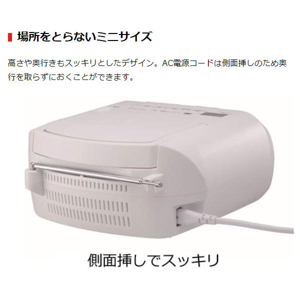 ミニサイズでしっかり聴ける! スリープタイマーつき 電源:AC100V 50/60Hz DC9V、単2形乾電池×6本(別売) 電池持続時間※1※2 :TOSHIBA 単2形アルカリ乾電池使用時 ラジオ受信時:約48時間:テープ再生時:約28時間 CD再生時:約15時間 スピーカー:Φ4cmコーン型×2 実用最大出力:1.0W-1.0W 消費電力※1:9W 最大外形寸法:228(幅)×110(高さ)×205(奥行)mm(突起物含まず) 質量:約1.5kg(乾電池、付属品含まず) 付属品:電源コード、取扱説明書(保証書付き) ※1:(社)電子情報技術産業協会の定める「JEITA規格」による測定値です。 ※2:電池時間の目安は、東芝アルカリ電池IMPALSE LR6Hを使用した場合です。 ※記載は商品仕様の一部です。仕様説明不足等の理由での返品はできません。特に適合等は必ずご確認ください。
