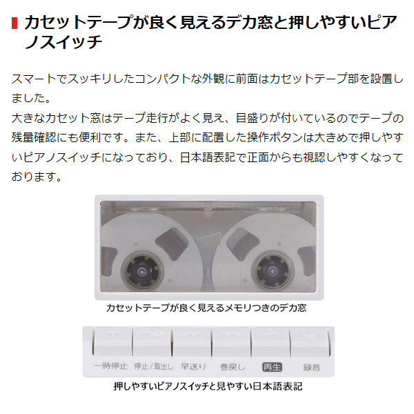 大きなカセット窓はテープ走行がよく見え、目盛りが付いているのでテープの残量確認にも便利です。また、上部に配置した操作ボタンは大きめで押しやすいピアノスイッチになっており、日本語表記で正面からも視認しやすくなっております。