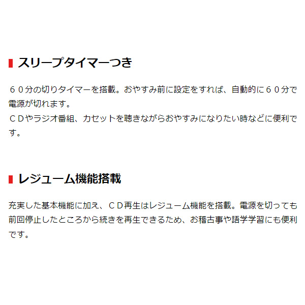充実した基本機能に加え、CD再生はレジューム機能を搭載。電源を切っても前回停止したところから続きを再生できるため、お稽古事や語学学習にも便利です。