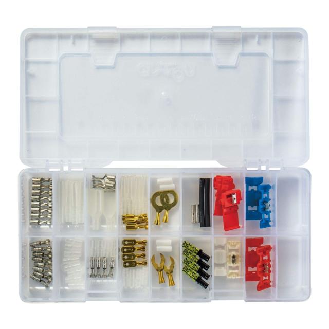 接続・分岐・電源取り出しができる端子セット。<br>細い線に対応できる端子・配線コネクター・接続コネクターも入っている。<br>小さな端子が取り出し易い底面R形状。<br>収納・整理に便利な透明ケース。<br>ケースは予備ポケットもあり、フタに便利なスケール付き(15cm目盛り(目安))。<br>【セット内容】<br>ギボシ端子/ス リーブ(オス・メス)・・・8セット・ギボシ端子ダブル/ス リーブ(オス・メス)・・・2セット・平型端子《250型》/ス リーブ(オス・メス)・・・4セット<br>クワ型端子《φ6》/ス リーブ・・・2セット・丸型端子《φ8》/ス リーブ・・・2セット・配線コネクター《白》・・・2個・配線コネクター《薄赤》・・・2個<br>配線コネクター《赤》・・・2個・配線コネクター《青》・・・2個<br>接続コネクター・・・2セット(4個)・圧縮接続端子収縮チューブ付・・・2セット<br>◆商品名:エーモン(amon) ターミナルセット 接続・分岐・電源取り出しができる端子のセット 3361<br>■接続・分岐・電源取り出しができる端子セット