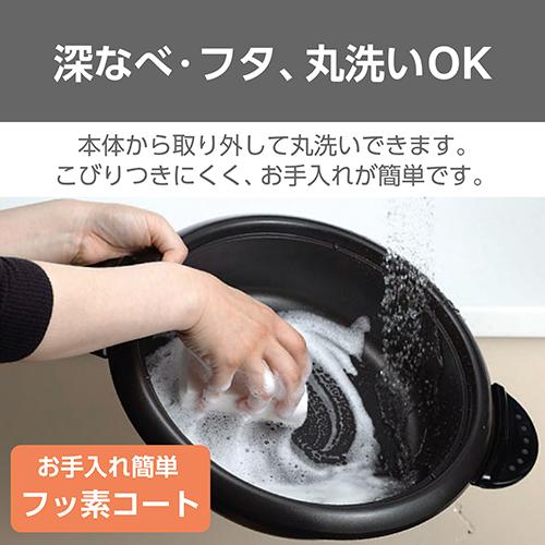 「鍋物」「焼物」「煮物」の1台3役!、みんなで囲む あつあつ鍋![]() ■直接コンロにかけられるから下ごしらえもスピーディーに※。 容量たっぷり3.4Lの深なべは1台3役。煮る・焼く・蒸すの調理で、お鍋も楽しめます。 ※ 必ずだし汁やスープを入れた状態でご使用ください。IH調理器では使用できません。 ■早く煮えて、待たせません。強火のお料理がより美味しく。 ■着脱ワンタッチ。 万が一ひっかかってもコードがすぐ外れるため、本体が動かず安心です。 ■深なべにはフッ素樹脂加工をほどこしてあるため、こびりつきにくく、お手入れが簡単です。 ■本体から取り外して丸洗いできます。 ![]() ■サイズ:高さ / 190mm 幅 / 390mm 奥行き / 310mm(深なべ・フタ装着時)、コードの長さ:1.8m ■質量:2.9kg(付属品含む) ■消費電力:1300W ■付属品:深なべ ・フタ ・マグネットプラグ付電源コード ■鍋容量:3.4L ■温度調節機能:保温〜250℃ ■カラー:カジュアルグレー ■パーツ:ふた(耐熱強化ガラス)(FU0018)、ふたつまみAss’y(FU0019)、深なべ(FU0012)、電源コード(FU0016) ■コード長:1.8m ■保証期間:1年 ■主材料:本体:PP なべ:アルミダイキャスト |