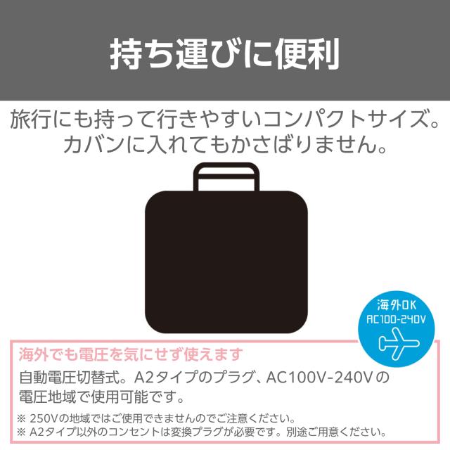 しっかりカールをどこでも手軽に。コンパクトでも本格派、26mmカール。![]() ■最高温度190℃で、コンパクトでも本格的なスタイリングができます。 ■内巻き外巻きを使い分けることで、豊富なカールスタイリング。※ 仕上がりには個人差がございます。 ■旅行にも持って行きやすいコンパクトサイズ。カバンに入れてもかさばりません。 ■自動電圧切替式。A2タイプのプラグ、AC100V-240Vの電圧地域で使用可能です。※ 250Vの地域ではご使用できませんのでご注意ください。※ A2タイプ以外のコンセントは変換プラグが必要です。別途ご用意ください。 ■髪との摩擦が少なく、滑りがなめらか。髪をいたわりながらスタイリングできます。また、セラミック配合により遠赤外線が熱をムラなく伝えます。 ■ねじれにくい回転式コードです。 ■置いたときに高温部が下に着かないスタンド形状です。 ■クイックコードバンド付きなので、ばらつきがちな電源コードもすっきりまとまり収納も簡単にできます。 ■<ブラシアイロンがおすすめな人>・アイロン初心者の人・やけどが心配な人・ボリュームアップしたい人<カールアイロンがおすすめな人>・巻きがとれやすい人・しっかりとクセ付けしたい人・髪が長い人 ![]() ■サイズ:高さ / 66mm 幅 / 233mm 奥行き / 34mm ■質量:235g ■消費電力:28W(AC100-240V) ■スイッチ:電源スイッチ「ON - OFF」 ■特徴:コンパクトサイズ・アイロン部最高温度:190℃・立ち上がり時間:約45秒 ※100℃到達時間。最高温度になる時間とは異なります。・髪に優しいセラミックコーティング・置きやすいスタンド形状・ねじれにくいシーベルコード ■Wet&Dry:× ■アイロン径:26mm ■ラク抜きプラグ:× ■海外使用:○ ■スチーム:× ■カラー:ブラック ■コード長:1.5m ■パーツ:クイックコードバンド(YL0042) ■保証期間:1年 ■主材料:本体:PC バレル:アルミニウム |