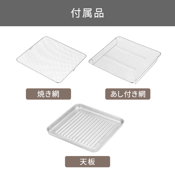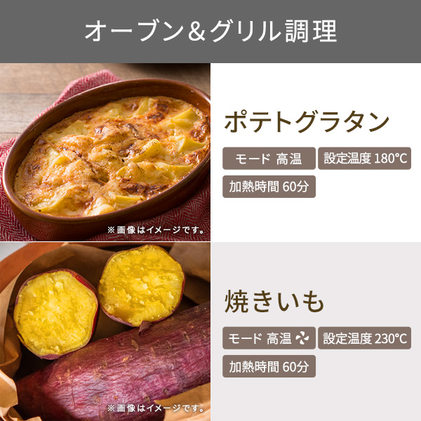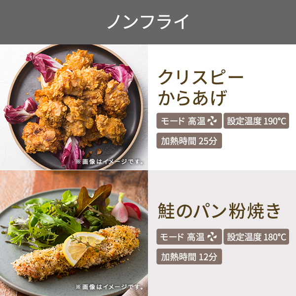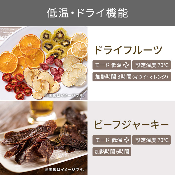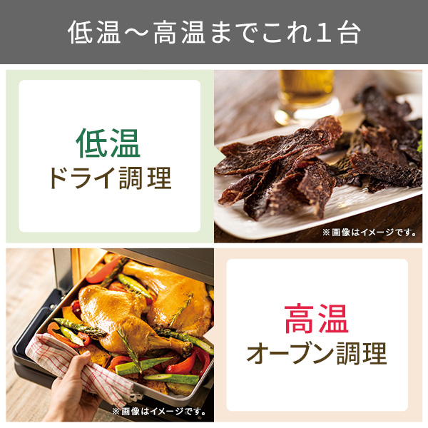 低温から高温までオフタイムも大活躍!、幅広い温度で料理の質を高める1台6役のマルチオーブン![]() ■低温×長時間でほったらかしたままプロの味わいに仕上がります。 ■果物や野菜を切って並べるだけで、自家製ドライフードが作れます。 お肉や魚介で作るお好みの味のジャーキーはおつまみに最高です。 ■専用のトーストモードで外はカリッと中はしっとりのトーストが焼きあがります。 新機能の上火グリルで仕上げればチーズトーストやピザトーストも最高の仕上がりに! ■グラタン・ピザなどのオーブン料理、野菜・魚・ハンバーグなどのグリル料理から焼き芋まで調理できます。 新機能の上火グリルでグラタンの焦げ目もおいしく焼き上げます。 ■油を使わない憧れのノンフライ! 熱風で加熱をすることで、表面サクッ、カリッと、中はジューシーなノンフライ料理が出来上がります。 買ってきたお惣菜もまるで揚げたてのようなサクサクな状態になって美味しくいただけます! ■35℃の低温から温められるから、ヨーグルトや甘酒も作れます。 パン生地の発酵も可能です。 ■低温長時間調理ができるので、ローストビーフや甘酒、ヨーグルトも作れます。 タイマーは最長12時間(低温モード時)まで対応。 寝ている時間やお買い物の間など、オーブントースターを使っていなかった時間を調理に有効活用する「オフタイム調理」ができます。 ※ 低温モード(35℃〜90℃)設定時 ■パンの仕上げの焼き目やグラタン・ピザのチーズの焦げ目作りまで、 料理下部はそのままに美味しい焦げ目をつけられるため、料理の幅が広がります。 *画像はイメージです。 ■幅広い温度帯。 低温は35℃から設定できるので発酵調理や低温調理も。 ※1:炒っていない豆類の粉砕、油分の多いナッツ類などをペーストにすることはできません。 ※2:粘り気の強いもの(茹でたかぼちゃ・いも類)のペーストはできません。茹でたにんじん等のペーストはできます。 ■幅広い温度帯。 高温は230℃まで設定できます。 ■本体サイズは抑えながら、広い庫内を実現しました。 食パンなら同時に4枚、一般的なチルドピザ(直径25cm)もそのまま入ります。 ■乾物はもちろん、ウェット対応で離乳食※2やドレッシングも作れます。フタ付きなのでそのまま保存ができます。 ※1:炒っていない豆類の粉砕、油分の多いナッツ類などをペーストにすることはできません。 ※2:粘り気の強いもの(茹でたかぼちゃ・いも類)のペーストはできません。茹でたにんじん等のペーストはできます。 ■上からの視界を妨げず、庫内が楽に確認できるハンドル形状です。 ■すぐに取り外せる、パンくずトレイがついているので、庫内に食材が落ちても、かんたんに掃除が可能。いつでも衛生的に使えます。 ■1台6役にも関わらず、サイズもコンパクトにまとめました。 一般的なオーブントースターと変わらない大きさで、限られたキッチンスペースにしっかり収まります。 ■本製品の底面には脚部(ゴム付)が4箇所あります。 脚部の位置は以下となります。 1(約)幅310×奥行215(mm) 【脚部の中心-中心間】 2(約)幅325×奥行235(mm) 【脚部の外径ー外径間】 3 背面カバー凸部から約105(mm) ※幅方向は左右対称 ※左右後方10cm・上方20cmのスペースをあけて設置してください。 ■料理家平井一代氏監修のレシピブックを付属。全44 レシピを収録。人気のサラダチキンや、スイーツまで、毎日楽しめます。 ■低温コンベクションオーブンで作る様々なレシピをご紹介! →レシピを見る ■※ 低温調理は温度により菌が繁殖しやすいことがあり、食中毒の恐れがあります。衛生的に調理をおこなってください。 ![]() ■サイズ:高さ / 240mm 幅 / 345mm 奥行き / 410mm ■質量:4.7kg ■消費電力:1200W ■付属品:天板 ・焼き網 ・あし付き網 ・レシピブック ■機能:タイマー 【デジタル】高温:30秒〜60分 / 低温:5分〜12時間 / トースト・上火グリル:30秒〜15分 ■温度調節幅:35〜230℃【20段階】低温:35/40/45/50/55/60/65/70/80/90、高温:100/120/140/160/180/190/200/210/220/230 ■カラー:スレートグレー ■コード長:1.0m ■パーツ:あし付き網(501346)、パンくずトレイ(501348)、レシピブック(501347)、焼き網(501344)、天板(501345) ■保証期間:1年 ■主材料:本体:鋼板、ハンドル:PBT/ABS、ドア:ガラス |